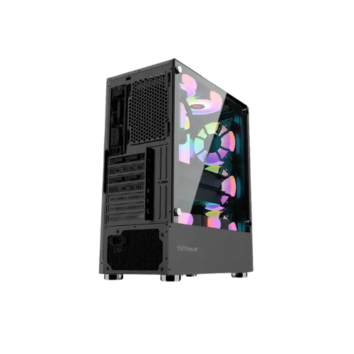El Armaggeddon Tritron 3 B presenta un innovador diseño de doble cámara con cubierta para la fuente de alimentación (PSU shroud) que separa los componentes principales del sistema de refrigeración y cableado, mejorando significativamente el flujo de aire, la gestión de cables y la estética general del interior. Fabricado en acero SPCC de 0.45 mm con panel lateral de vidrio templado, está disponible en acabados completamente negro o completamente blanco para adaptarse a diferentes estilos de construcción. La gestión de cables es limpia y profesional gracias al enrutamiento oculto que mantiene el interior ordenado y despejado. Incluye de serie 3 ventiladores ARGB de 120 mm en la parte frontal, listos para iluminar y refrigerar el sistema desde el primer momento. Soporta tarjetas gráficas de hasta 305 mm de longitud, coolers de CPU con altura máxima de 165 mm y fuentes de alimentación de tamaño estándar. Ofrece bahías internas para 2 unidades de 2.5″ o 3.5″, adaptándose a diferentes configuraciones de almacenamiento. El panel frontal de E/S cuenta con 1 puerto USB 3.0, 2 puertos USB 2.0, puerto de audio y micrófono. Las opciones de refrigeración adicional incluyen soporte para ventiladores traseros de 120 mm y superiores de 2×120 mm, así como radiador de refrigeración líquida de 120 mm. Con dimensiones de 380 mm de largo, 190 mm de ancho y 447 mm de alto (incluyendo patas), ofrece un equilibrio entre tamaño compacto y capacidad para componentes gaming de alto rendimiento.